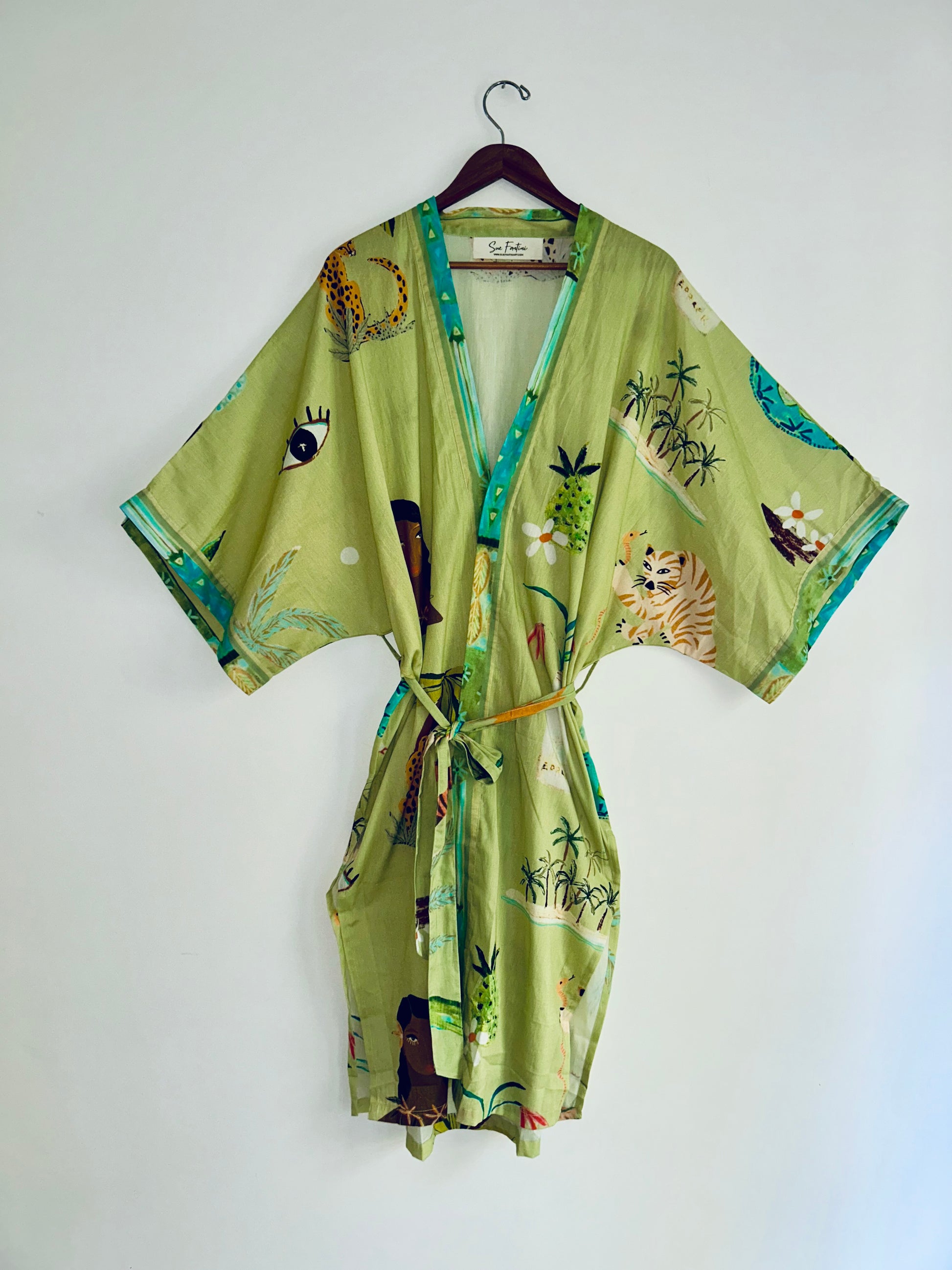 Designed in house and manufactured in India under ethical production, this versatile piece features our playful Into the Wild Print & can be worn belted or loose over comfy pants and a top and is also a perfect beach cover up and travel companion.